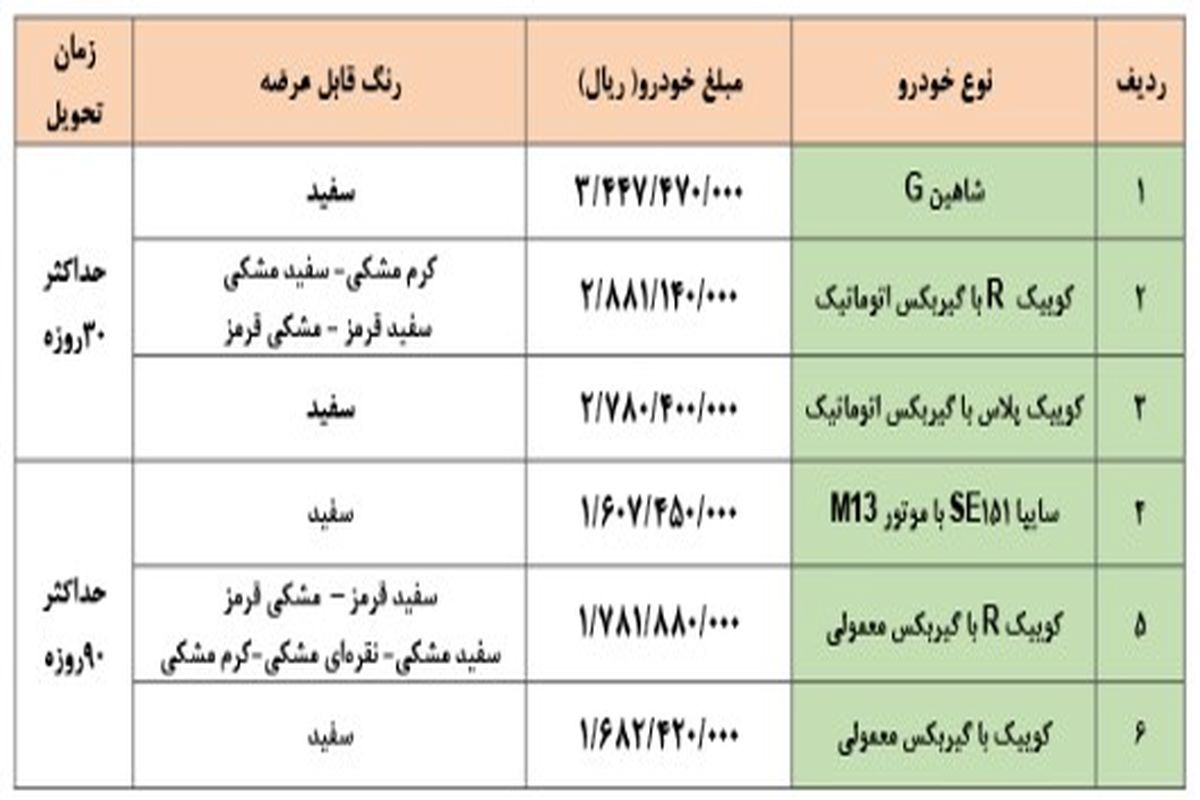 به گزارش خبرگزاری برنا، گروه خودروسازی سایپا، از فردا چهارشنبه 11 آبان ماه فروش فوری شاهین دنده ای تیپ G، کوییک معمولی، کوییک آر، کوییک آر اتوماتیک، کوییک پلاس اتوماتیک و وانت ۱۵۱ عرضه می شوند. موعد تحویل شاهین، کوییک آر اتوماتیک و کوییک پلاس اتوماتیک ۳۰ روز کاری اعلام شده است و سه خودروی دیگر موعد تحویل ۹۰ روز کاری را دارند.