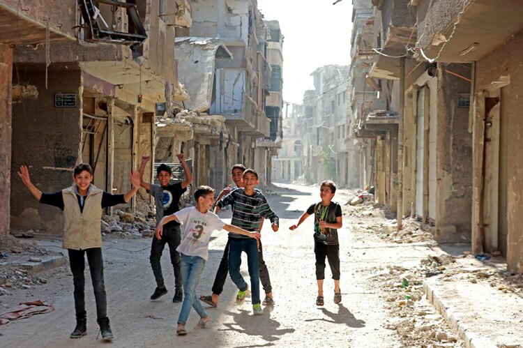کودکان سوری در میان ساختمانهای ویران شده در جنگ داخلی، در اردوگاه آوارگان "یرموک" در حومه جنوبی شهر دمشق بازی میکنند./ خبرگزاری فرانسه