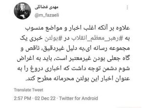 به گزارش مشرق، مهدی فضائلی عضو دفتر حفظ و نشر آثار رهبر انقلاب در حساب کاربری خود نوشت: «علاوه بر آنکه اغلب اخبار و مواضع منسوب به رهبر معظم انقلاب در بولتن خبری یک مجموعه رسانهای، به دلیل غیردقیق، ناقص و گاه جعلی بودن غیرمعتبر است، باید به اغراض شوم دشمن توجه داشت که اخباری دروغ را به عنوان اخبار این بولتن محرمانه مطرح کند.»
