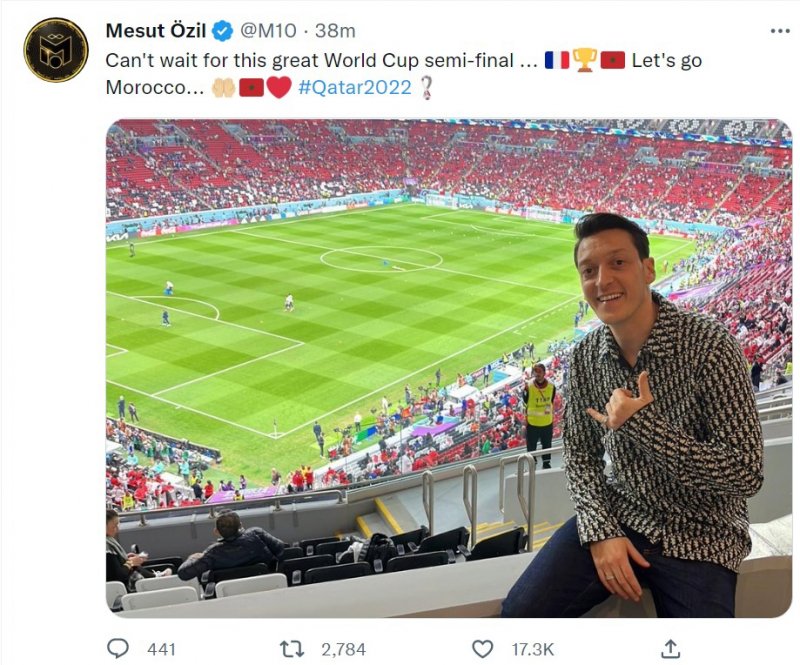 مسوت اوزیل، ستاره آلمانی و ترکتبار فوتبال دنیا که این روزها فوتبالش را در باشگاههای ترکیه دنبال میکند، سابقه قهرمانی در جام جهانی با تیم ملی آلمان را در سال 2014 دارد. او دقایقی پیش توییتی منتشر کرد و نوشت:" بیصبرانه منتظرم که دیدار بزرگ نیمهنهایی بین مراکش و فرانسه را ببینم. بزن بریم مراکش".