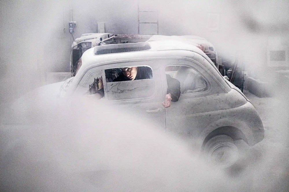 "نازارنو بیندو" هنرمند ایتالیایی از داخل فیات 500 ساخته شده با سنگ مرمر معروف منطقه "کارارا" ایتالیا در شهر تورین این کشور ژست می‌گیرد/ Getty Images