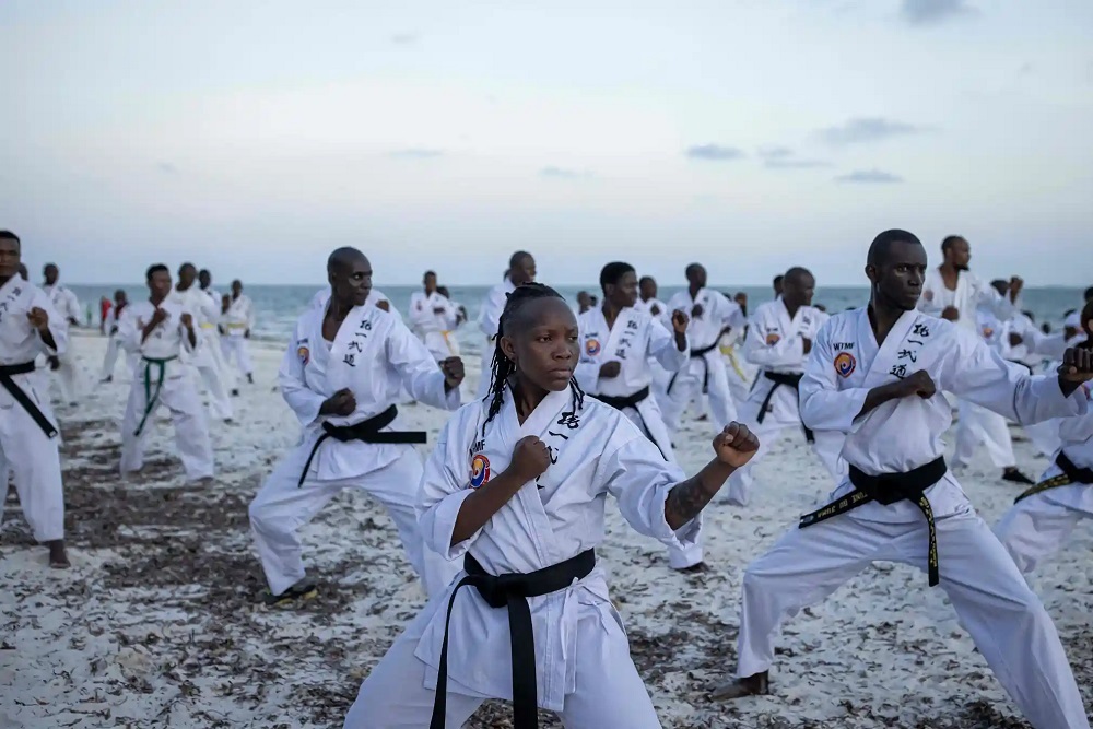 ورزشکاران در حال اجرای یک نمایش ساحلی در دهمین دوره مسابقات قهرمانی بین‌المللی هنرهای رزمی "تانگ ایل مو دو" یا هنر رزمی واحد در مومباسای کنیا/ خبرگزاری فرانسه