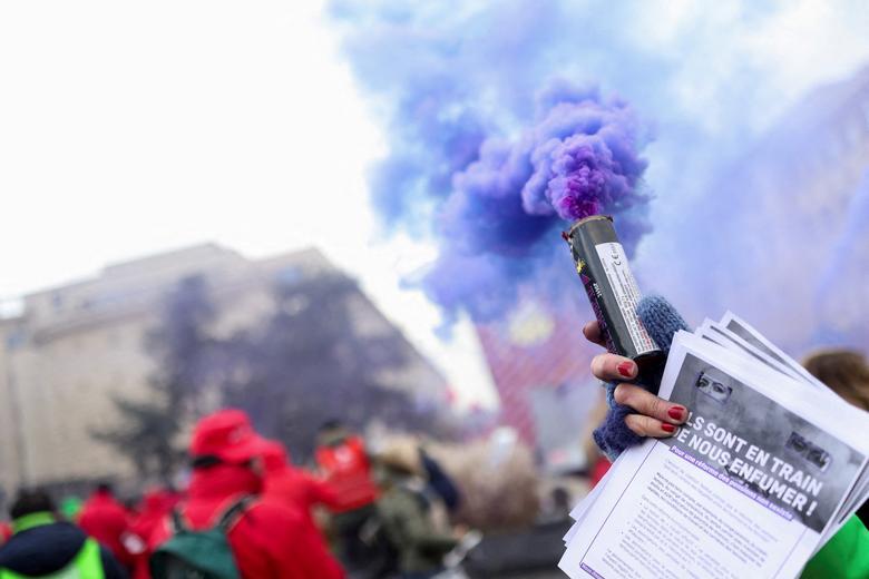 یک معترض به افزایش هزینه های زندگی در بروکسل بلژیک وسیله‌ای دودزا را در تظاهرات در دست دارد/ عکس: رویترز