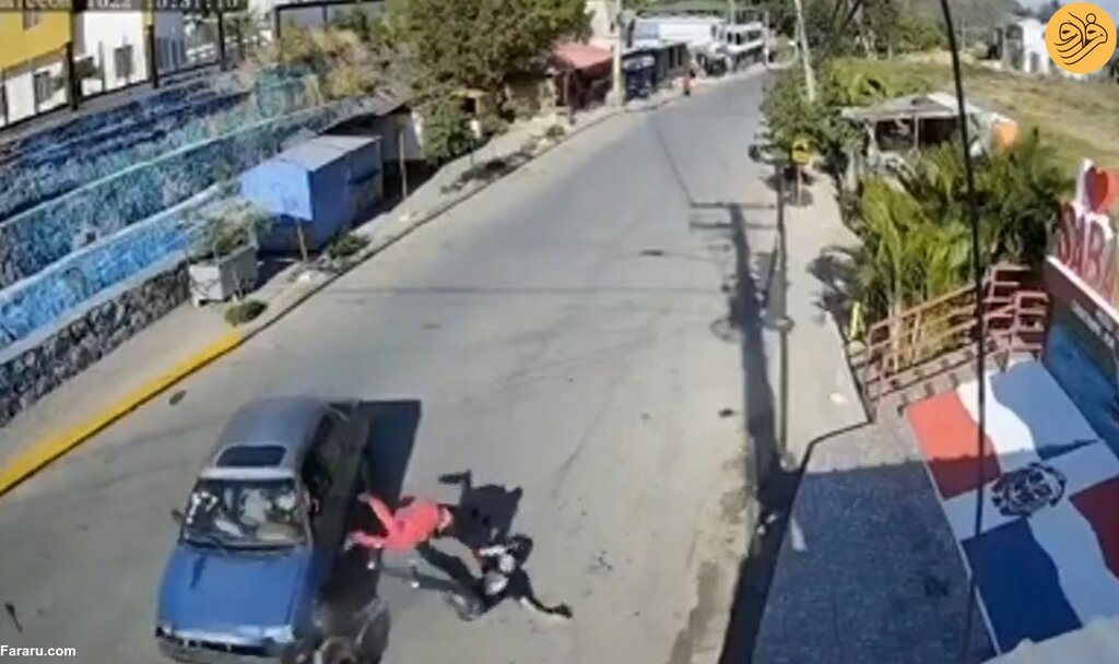 اتفاقی عجیب رخ داد. دوربین مداربسته در این خیابان لحظه برخورد یک خودروی سواری به یک موتورسیکلت با دو سرنشین را ضبط کرده است. در پی این تصادف سوارها به زمین افتادند. اما راننده موتور بلافاصله برخاست و با یک پرش و لگد صورت راننده خودرو را هدف قرار داد. ضرب و شتم راننده خودرو ادامه پیدا کرد تا اینکه عابران پیاده از راه رسیدند.