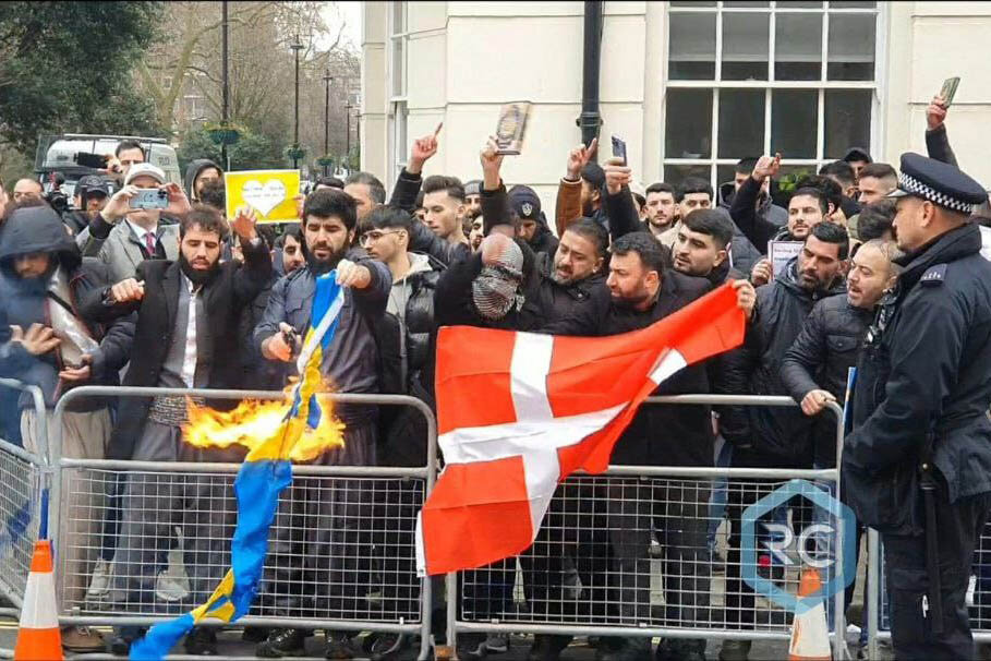 مسلمانان معترض به هتک حرمت قرآن کریم در مقابل سفارت سوئد در انگلیس تجمع اعتراضی برگزار کردند و تصویر راسموس پالودان، سیاستمدار راست افراطی که به تازگی در دانمارک به قرآن هتک حرمت کرده بود، آتش زدند.
