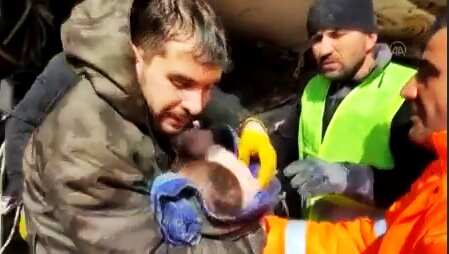 یک نوزاد هفت ماهه، ۶۶ ساعت پس از وقوع زلزله ترکیه در استان حتای از زیر آوار نجات پیدا کرد. لحظه زیبایی که امدادگران این نوزاد را خارج کردند، ببینید.