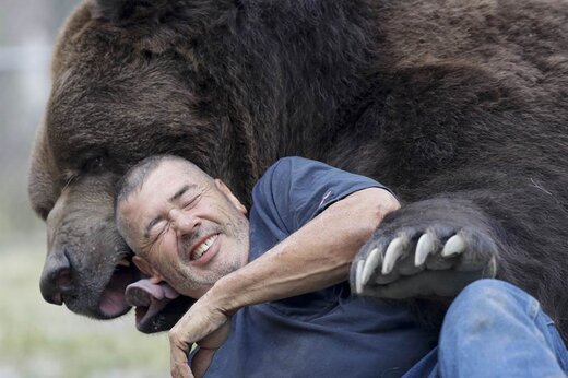 ویدیویی پر بازدید از در آغوش گرفتن یک مرد توسط خرس قهوهای را مشاهده میکنید.