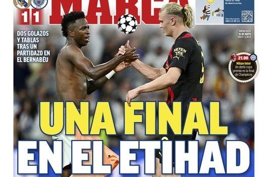 "فینال در اتحاد" تیتر اصلی روزنامه مارکاست. تصویر ارلینگ هالند و وینیسیوس پشت این تیتر اشاره به مشخص شدن سرنوشت تیم صعود کننده به فینال در ورزشگاه اتحاد دارد.