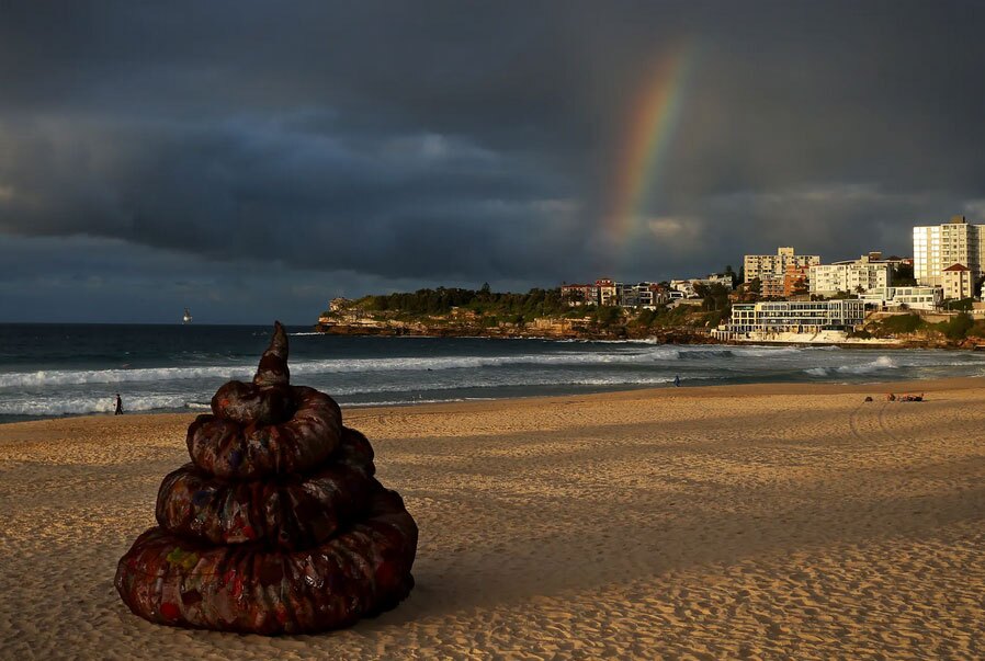 میزان زباله های پلاستیکی که در هر 30 ثانیه به اقیانوس ها می ریزد. این سازه با ارتفاع 4 متر و به شکل مدفوع انسانی در ساحل سیدنی استرالیا قرار داده شده و از زباله های پلاستیکی تهیه شده تا میزان زباله های انسانی که به اقیانوس ها می ریزد را نشان دهد./ گتی ایمجز