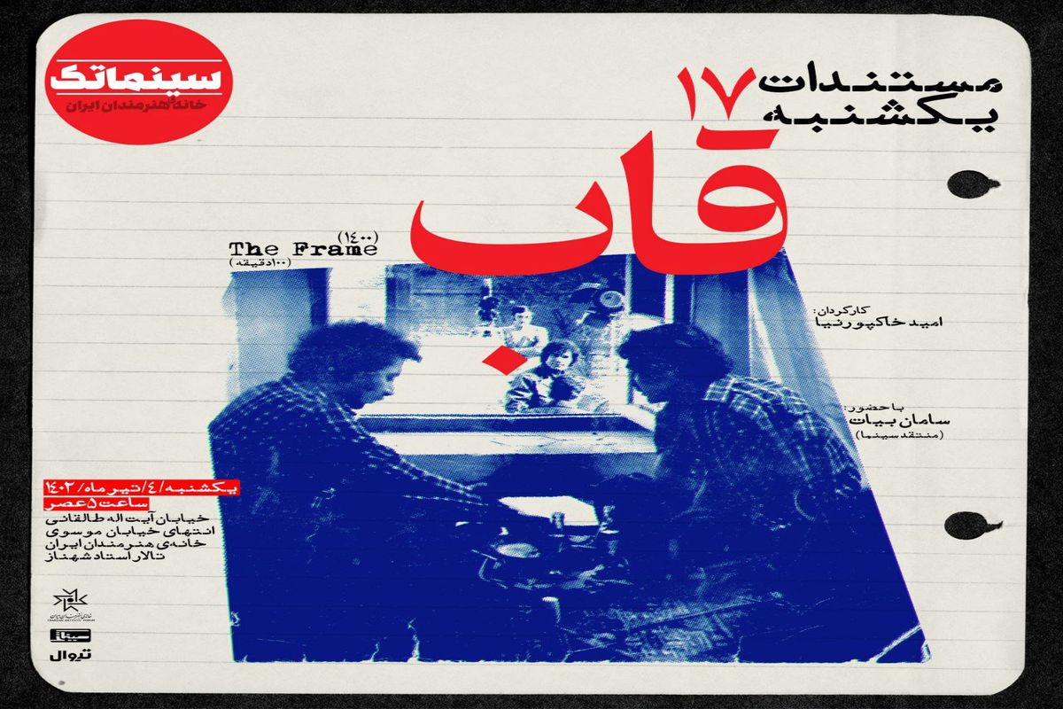 به گزارش گروه فرهنگ و هنر برنا؛ هفدهمین برنامه «مستندات یکشنبه» که زیرمجموعه سینماتک خانه هنرمندان ایران به پخش فیلمهای مستند میپردازد، به نمایش فیلم مستند «قاب» ساخته امید خاکپورنیا محصول سال ۱۴۰۰ اختصاص دارد. این برنامه روز یکشنبه چهارم تیرماه ۱۴۰۲ از ساعت ۱۷ در سالن استاد شهناز برگزار میشود.