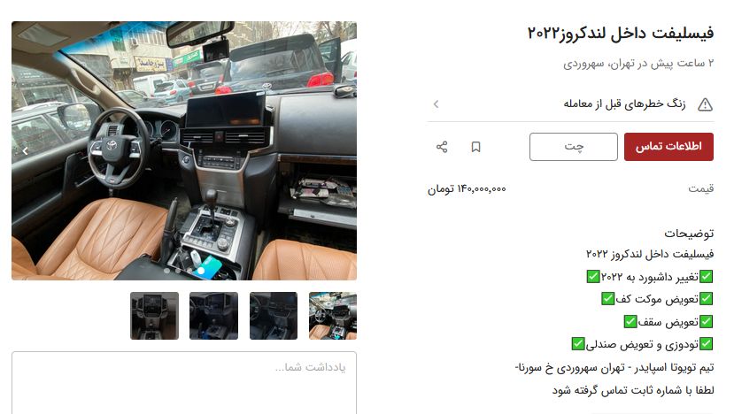 به عنوان مثال با تغییر داشبود و تودوزی صندلیهای لندکروز و با دریافت ۱۴۰ میلیون تومان خودرو را به مدل ۲۰۲۲ تبدیل میکنند.