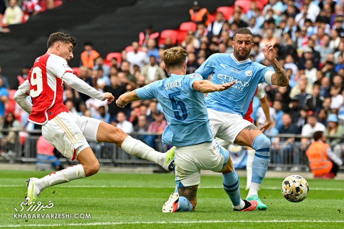 نیمه نخست سیتی بیشتر مالکیت توپ را در اختیار داشت، اما هردو تیم شانسهای گلزنی خوبی خلق کردند که نتیجهای نگرفتند و تساوی بدون گل نتیجه نهایی بود. نیمه دوم را سیتی تهاجمی شروع کرد، ولی خیلی زود آرسنال از لاک دفاعی بیرون آمد و این تیم هم روی دروازه برنده سهگانه فصل گذشته خطرناک ظاهر شد. در دقیقه ۶۴ کوین دیبروینه که مصدومیت داشت از سوی پپ گواردیولا فراخوانده شد تا جای متئو کواچیچ را درون ترکیب سیتی بگیرد. کاپیتان جدید سیتی در دقیقه ۷۷ تأثیر خودش را گذاشت و با قطع توپ باعث شد به کول پالمر برسد که این بازیکن جوان با شوت زیبای پای چپ گل برتری بازی را برای تیم گواردیولا به ثمر رساند. آرسنال دوباره برای زدن گل فشار آورد و لئاندرو تروسار هافبک بلژیکی که در دقیقه ۷۵ جانشین گابریل مارتینلی شده بود با شوتی که زد و با برخورد به پای مدافع سیتی منحرف شد، در دقیقه ۱۱+۹۰ کار را به تساوی کشاند.