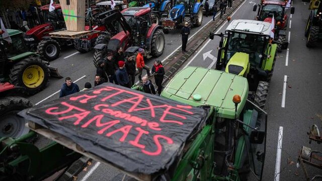 به نقل از تی. آر. تی، کشاورزان از روز پنجشنبه برای تحتفشار قراردادن دولت، بزرگراه A۶۴ در نزدیکی «کاربن» در «اکسیتانی» را مسدود کردهاند. بزرگراه A۶۴ در چند ساعت به کانون خشم دنیای کشاورزی تبدیل شد، جایی که سدی متشکل از پنجاه تراکتور برای بستن جاده ایجاد شده است.
