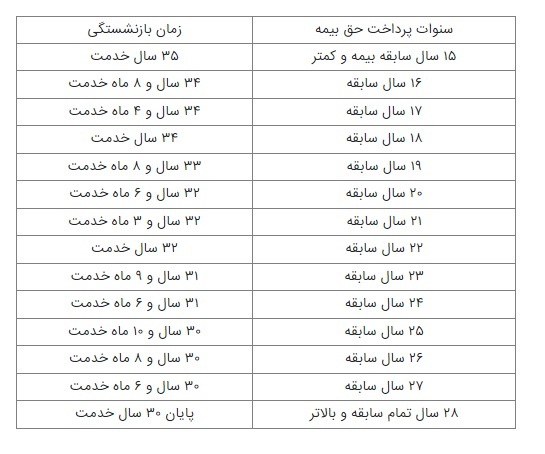 ۲. افراد دارای سابقه پرداخت حق بیمه بین ۲۵ تا ۲۸ سال، به ازای هر سال باقی مانده تا ۳۰ سال خدمت، ۲ ماه به زمان واریز حق بیمه الزامی آنها افزوده میشود