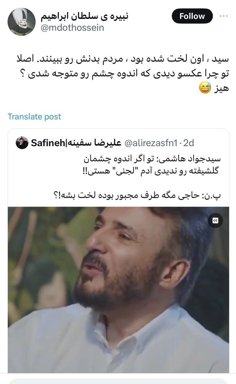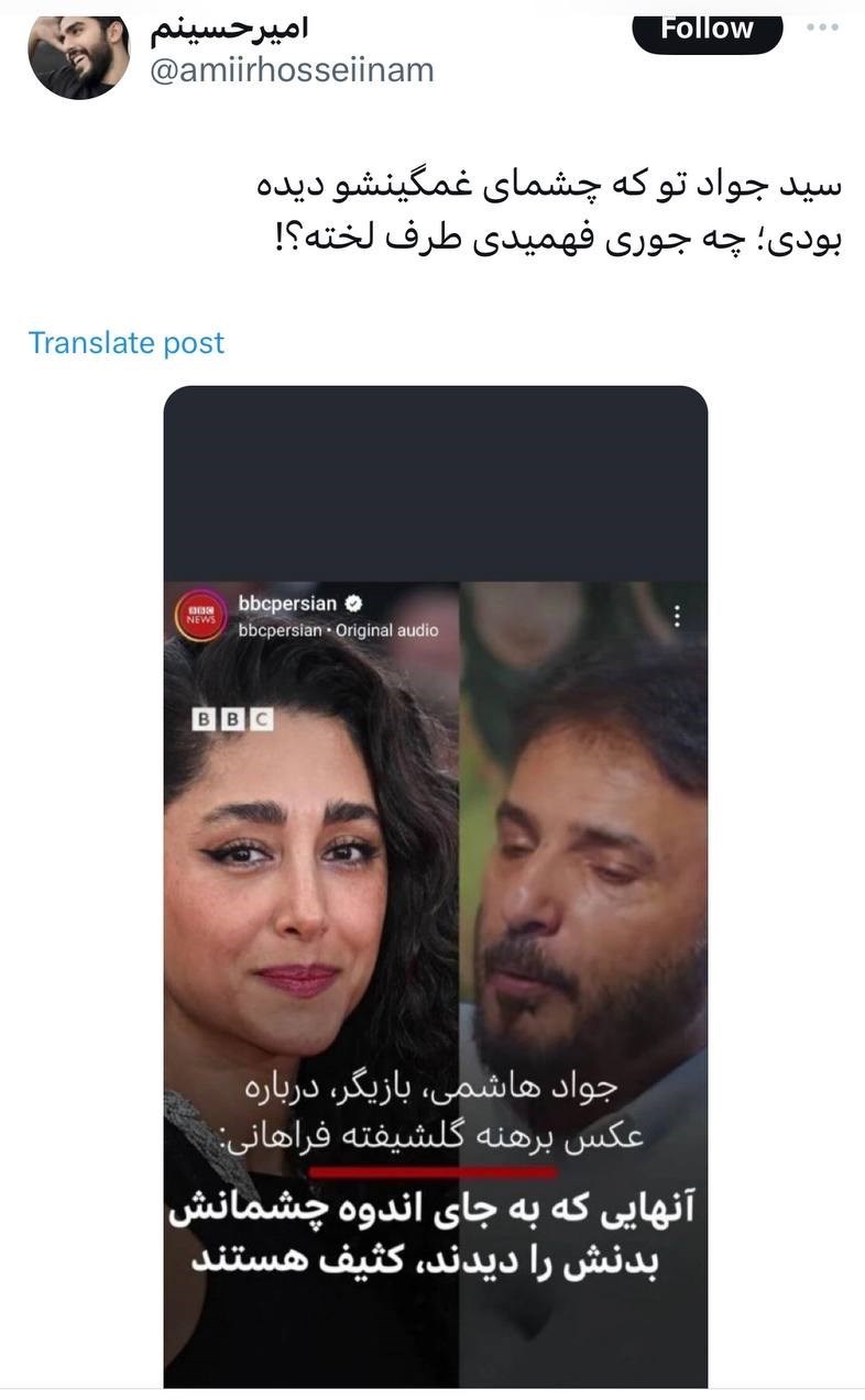 سید جواد هاشمی بازیگر سینما و تلویزیون اخیراً با اشاره به تصویر برهنهای که چند سال پیش گلشیفته فراهانی از خود منتشر کرده بود، گفته که آنها که اندوه چشمان او را ندیدند ولی تن لختش را در عکس دیدند خیلی لجن هستند!